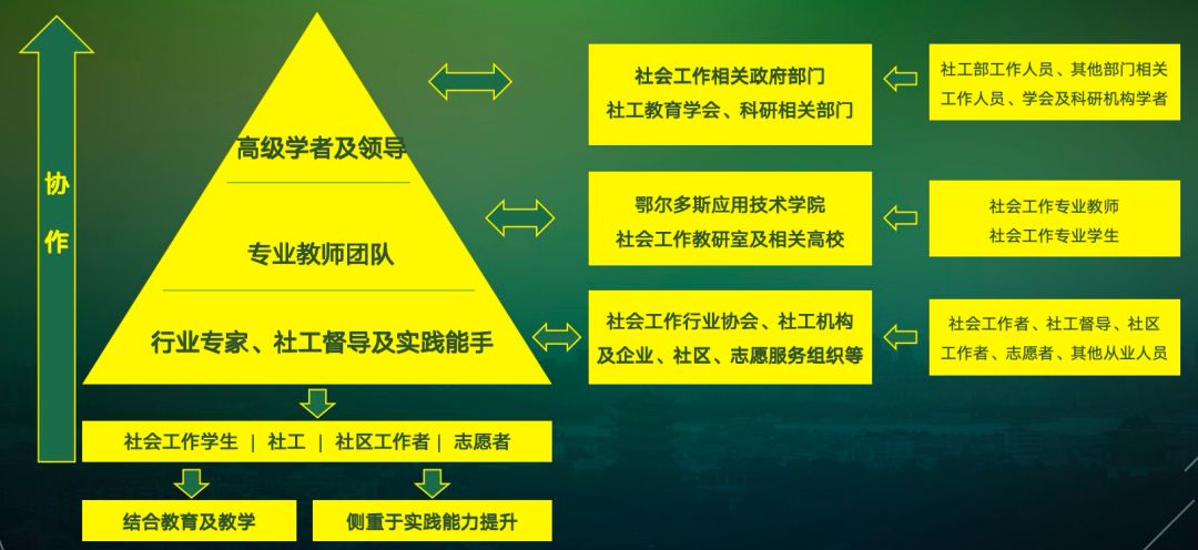在新時代社會治理創新與社會工作專業化發展的雙重需求下,鄂爾多斯應用技術學院社會工作產學研虛擬教研室(以下簡稱 “社工虛擬教研室”)聚焦傳統社會工作教育中 “理論與實踐脫節、資源整合碎片化、人才培養與行業需求錯位” 等核心問題,以 “搭建虛實融合平臺、整合校政行社資源、培養復合型社工人才、服務社會治理創新” 為目標,致力于構建集教學、科研、實踐于一體的新型教研生態。通過整合高校、政府、行業協會、社工機構等多方資源,開發適配學生、社區工作者、社會工作者的課程體系與實踐資源,推動解決學生培養 “理實差異”、行業人才 “系統課程缺失”、社會治理 “專業化不足” 等現實難題,實現虛擬教研室對教學、教師、學生及社會治理的多維賦能。