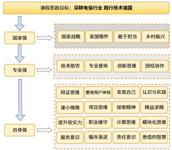 課程凝練了“深耕電信行業(yè),踐行技術(shù)強(qiáng)國(guó)”的思政目標(biāo),并從國(guó)家強(qiáng)、專業(yè)強(qiáng)及自身強(qiáng)三個(gè)層面挖掘思政元素。全課思政元素如下圖1所示。