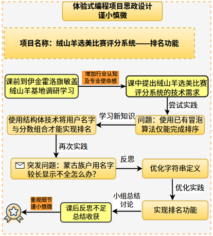 以絨山羊選美比賽評(píng)分系統(tǒng)實(shí)現(xiàn)排名功能、思政點(diǎn)“謹(jǐn)小慎微”為例,詳細(xì)描述思政元素融入過(guò)程,下圖2案例流程圖。