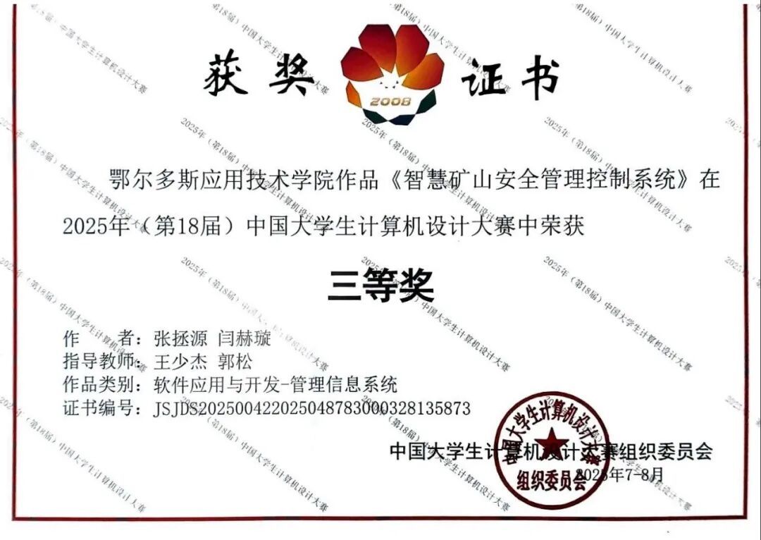 由數(shù)學(xué)與計算機(jī)工程學(xué)院教師王少杰、郭松指導(dǎo),張拯源、閆赫璇兩名學(xué)生組成的團(tuán)隊(duì),憑借作品《智慧礦山安全管理控制系統(tǒng)》在軟件應(yīng)用與開發(fā)賽道榮獲國家三等獎。該作品針對礦山安全管理難題,運(yùn)用先進(jìn)的計算機(jī)技術(shù)構(gòu)建智能控制系統(tǒng),致力于提升礦山生產(chǎn)的安全性與管理效率,其創(chuàng)新性和實(shí)用性得到了評委的認(rèn)可。