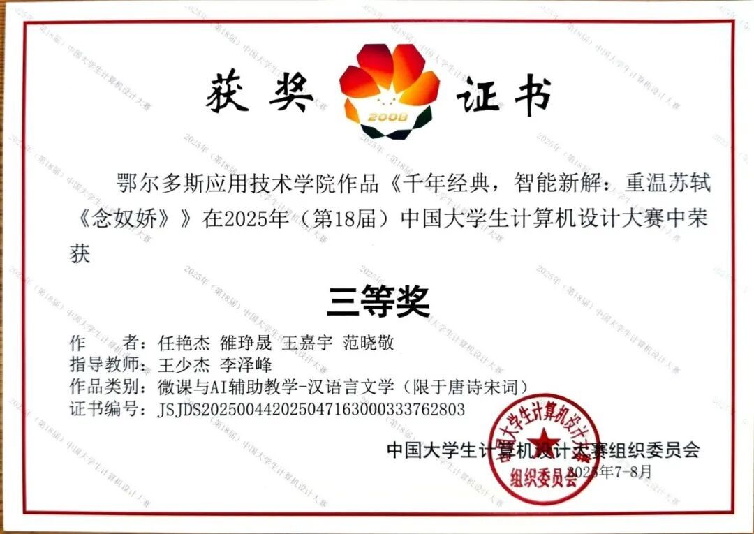 由數(shù)學(xué)與計算機(jī)工程學(xué)院教師王少杰、李澤峰帶隊(duì),任艷杰、雒琤晟、王嘉宇、范曉敬四名學(xué)生共同完成的作品《千年經(jīng)典,智能新解:重溫蘇軾<念奴嬌>》,在微課與AI輔助教學(xué)賽道中脫穎而出。該作品巧妙運(yùn)用現(xiàn)代信息技術(shù),對經(jīng)典詩詞進(jìn)行創(chuàng)新解讀,將傳統(tǒng)文化與前沿科技相結(jié)合,以新穎的視角和呈現(xiàn)方式,展現(xiàn)出獨(dú)特的魅力,榮獲三等獎。