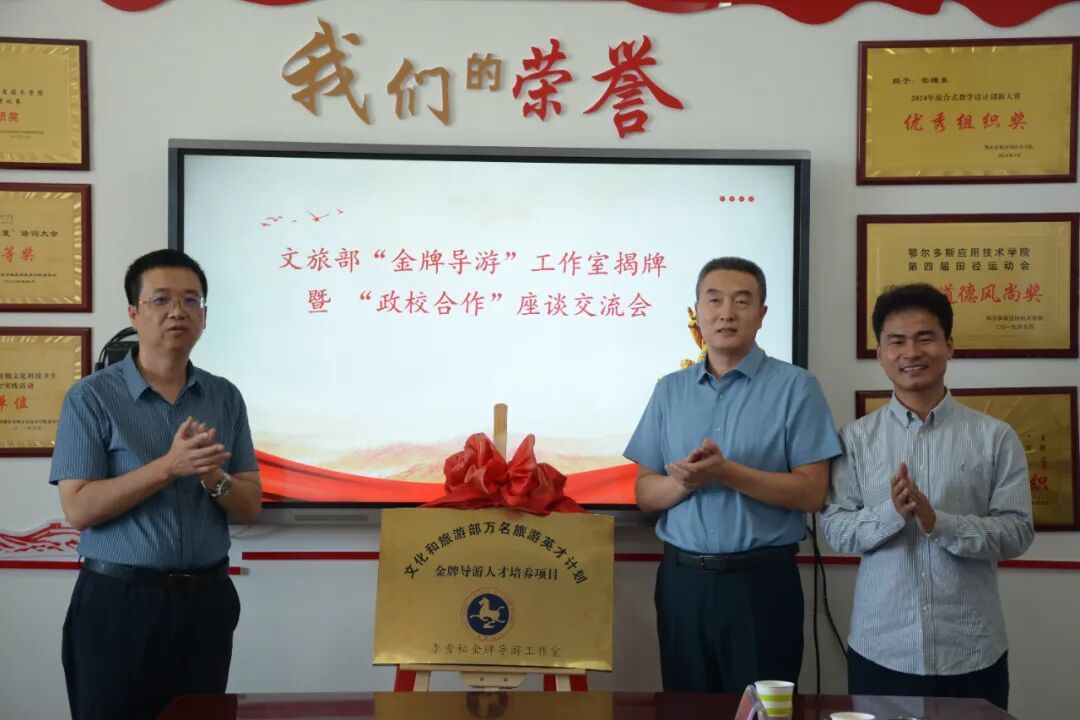 9月10日,文化和旅游部“金牌導游”工作室授牌儀式在我校管理學院舉行。市文化和旅游局黨組成員、文化市場綜合行政執法局局長丁曉東,學校黨委委員、副校長姜鑫共同為工作室揭牌。