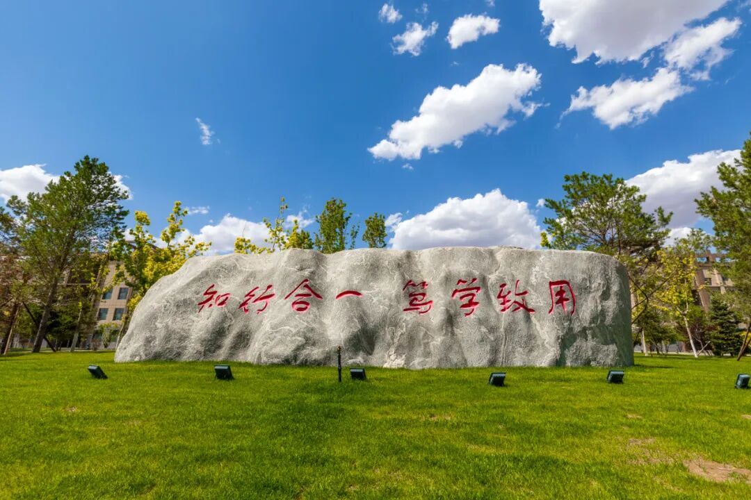 校門前的校名沈鵬親題流光溢彩,巨石上的校訓舒同體紅漆飛揚,“知行合一”承千載明德致理,“篤學致用”續百年求新向上。