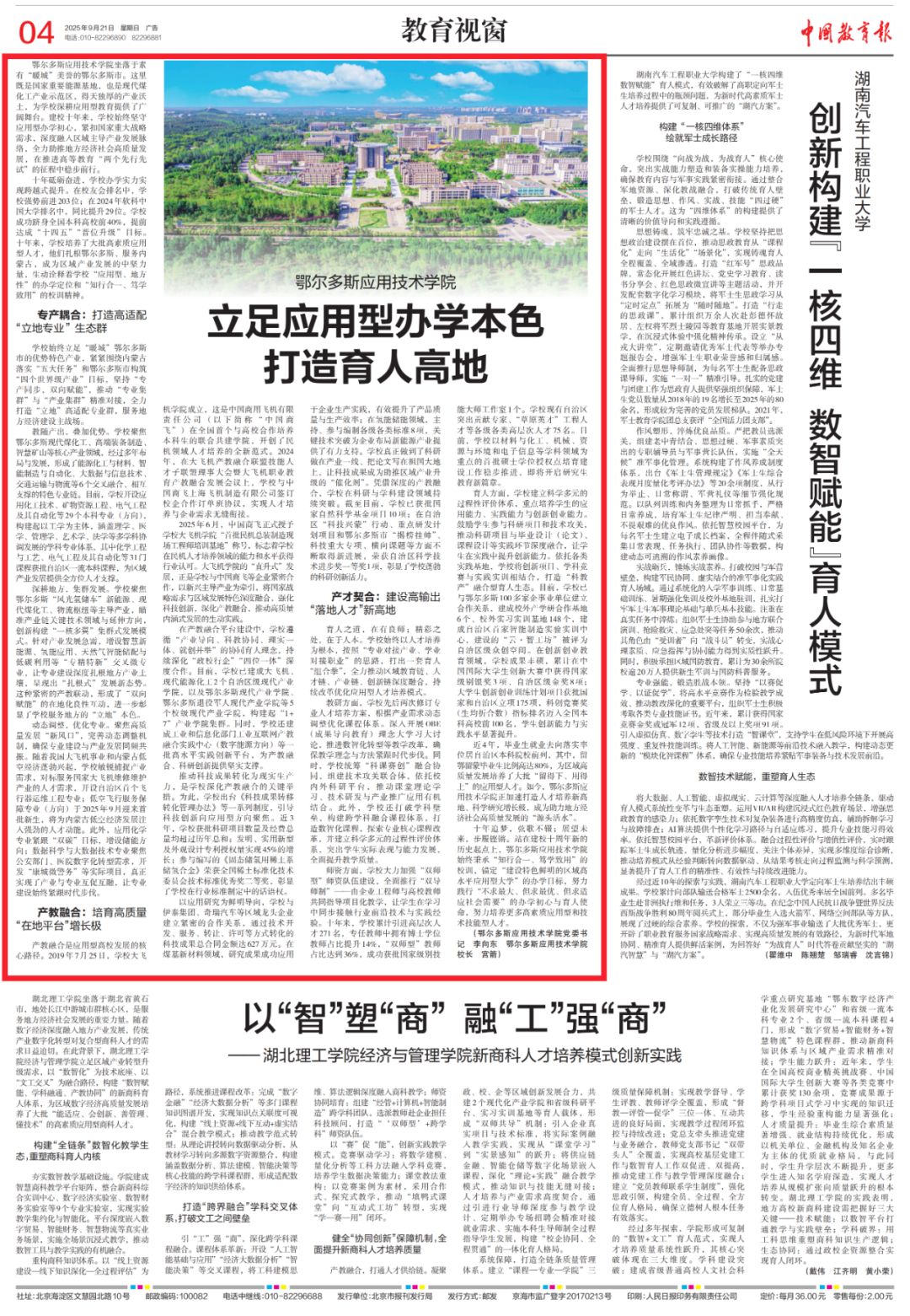 9月21日,學校黨委書記李向東,黨委副書記、校長宮箭在《中國教育報》發表署名文章《鄂爾多斯應用技術學院 立足應用型辦學本色 打造育人高地》。全文如下: