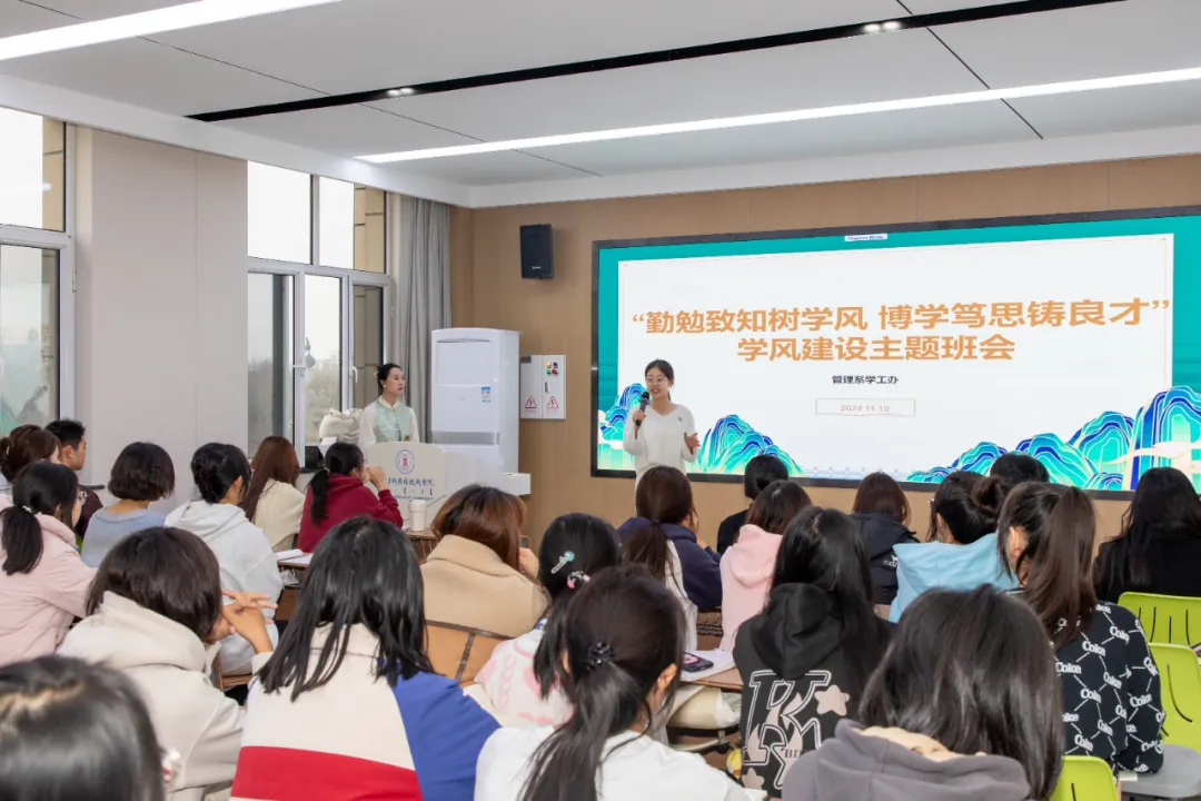 11月19日上午,管理系2024級財務管理2班舉辦以“勤勉致知樹學風,博學篤思鑄良才”為主題的學風建設班會。學校黨委副書記秦聞蘋出席班會并作思想政治專題報告。