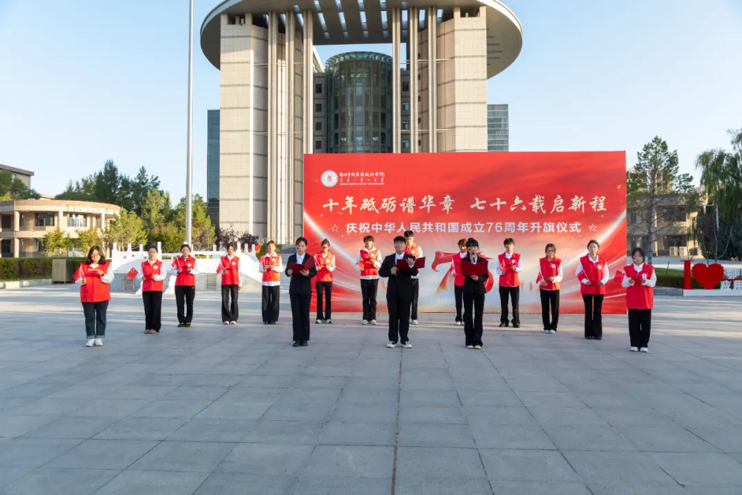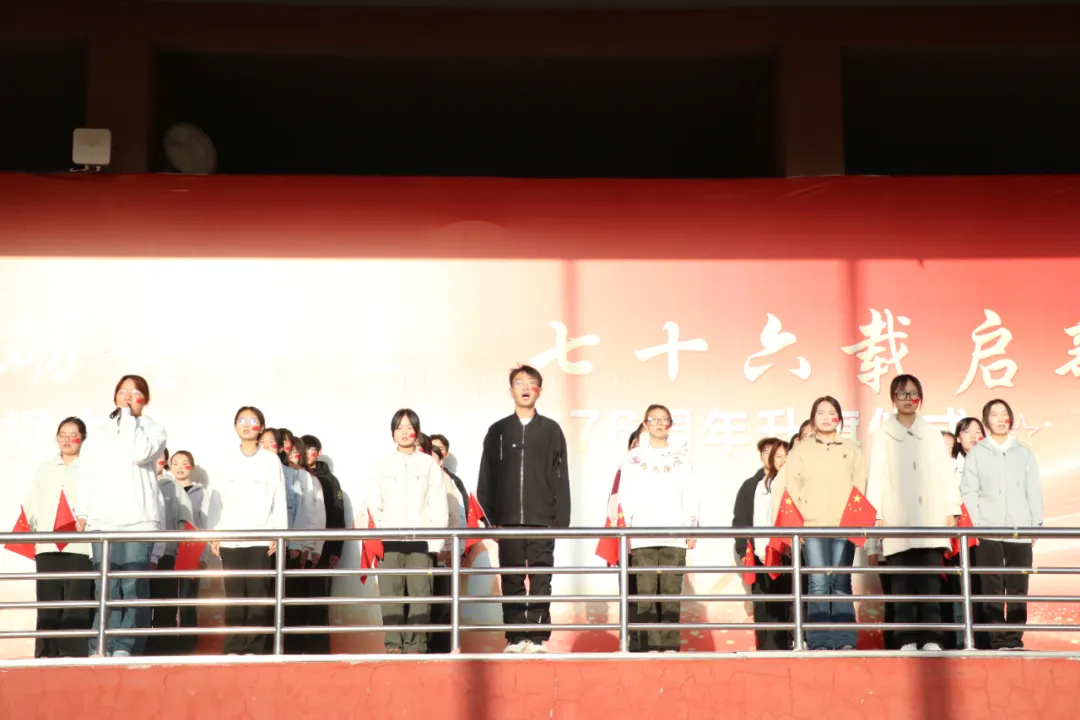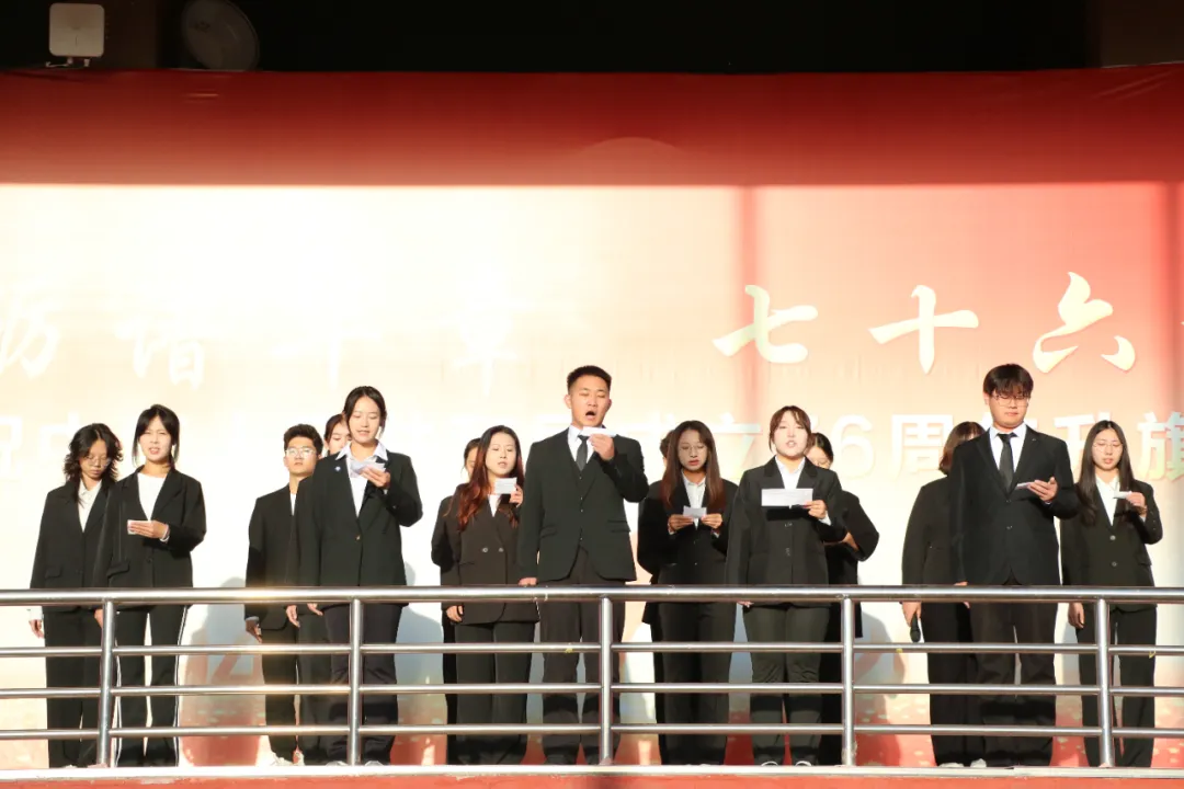 儀式尾聲,全體師生共同合唱《我和我的祖國》,用歌聲獻(xiàn)上對祖國76歲華誕的真摯祝福。