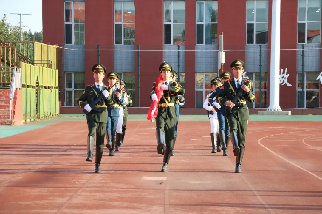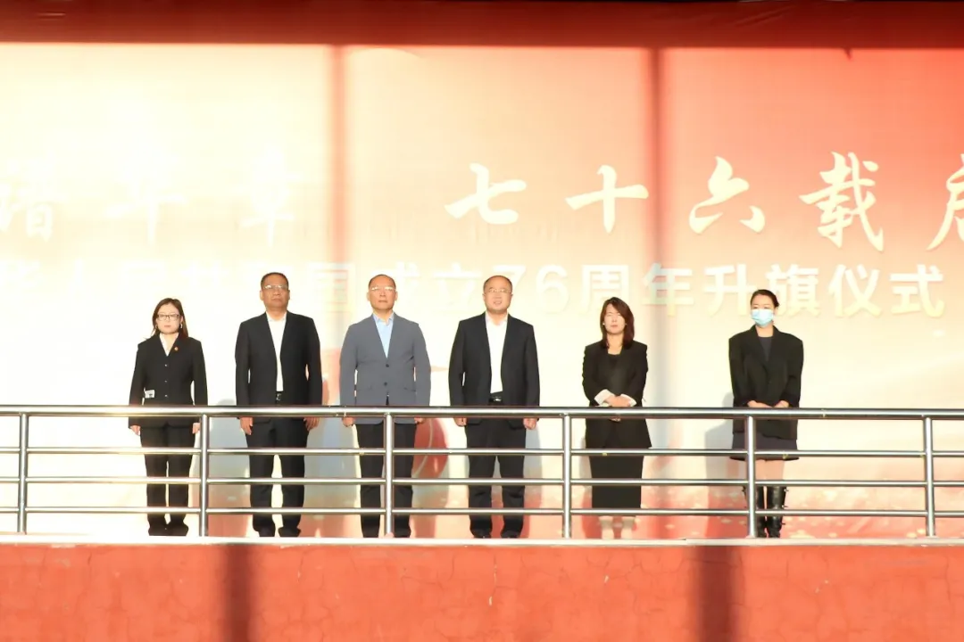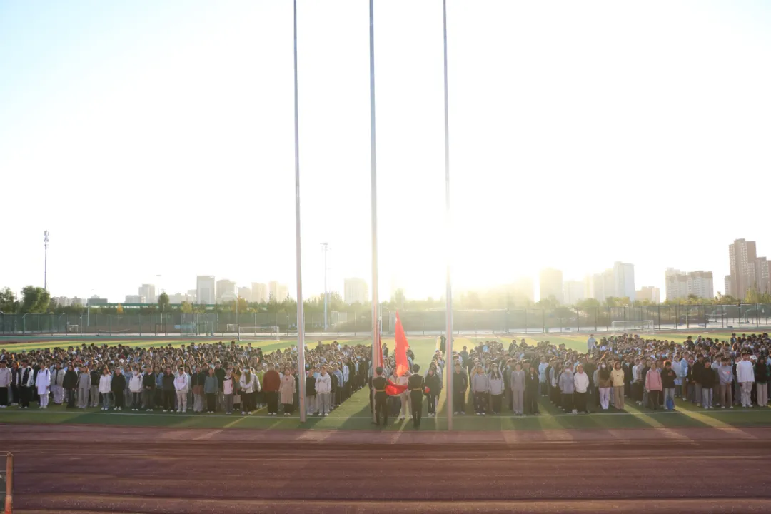 在雄壯的國歌聲中,儀仗隊步伐鏗鏘,護(hù)衛(wèi)著五星紅旗在晨曦中冉冉升起。全場師生面向國旗臺肅立,行注目禮,表達(dá)對偉大祖國的崇高敬意和深深祝福。
