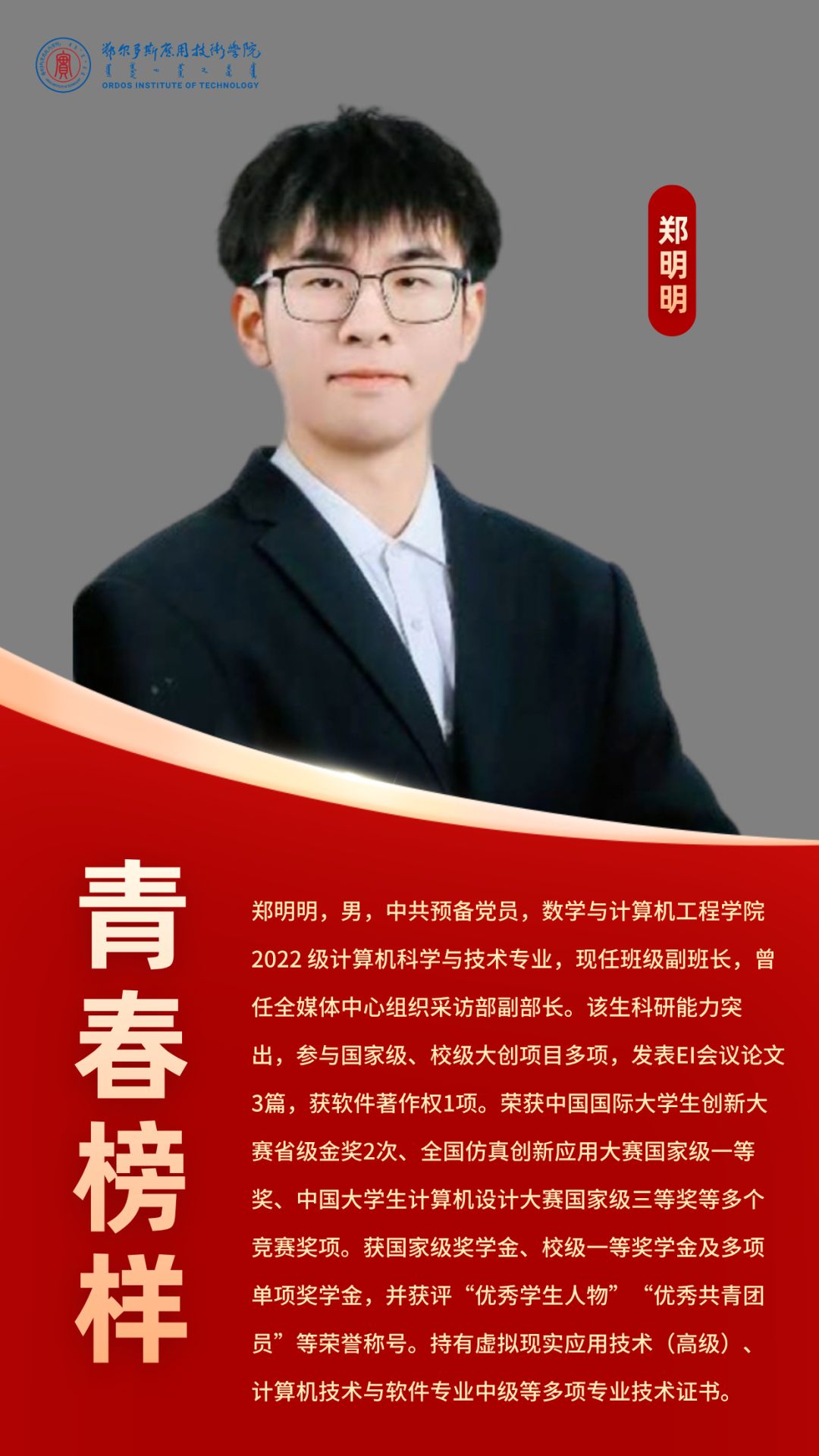 比賽現場還為前期投票環節中票數最高的選手頒發了“最佳人氣獎”。來自數學與計算機工程學院的鄭明明憑借1996票的超高人氣脫穎而出,摘得該獎項,其青春風采與榜樣力量獲得了師生們的廣泛認可。