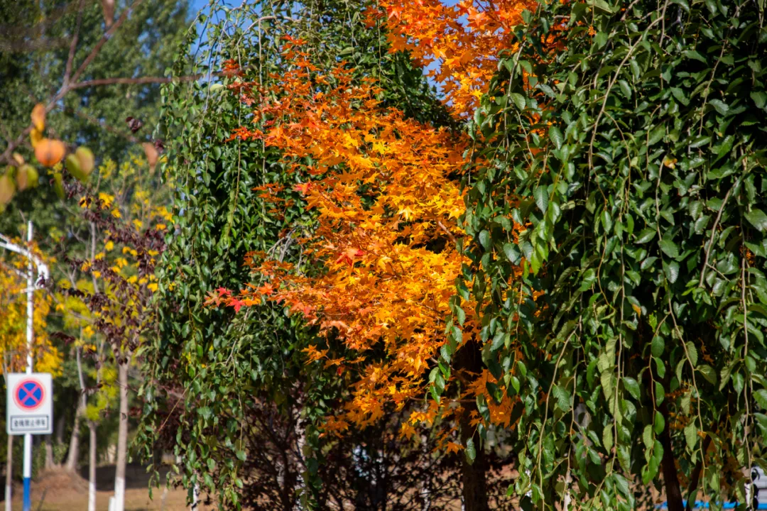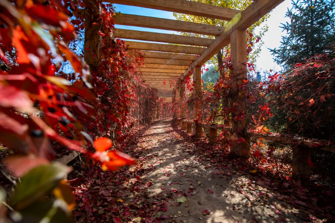 秋色如畫,漫步鄂應院,楓葉小路上,落葉鋪就了一條金色道路,翠綠與緋紅交織,勾畫出獨特的撞色美